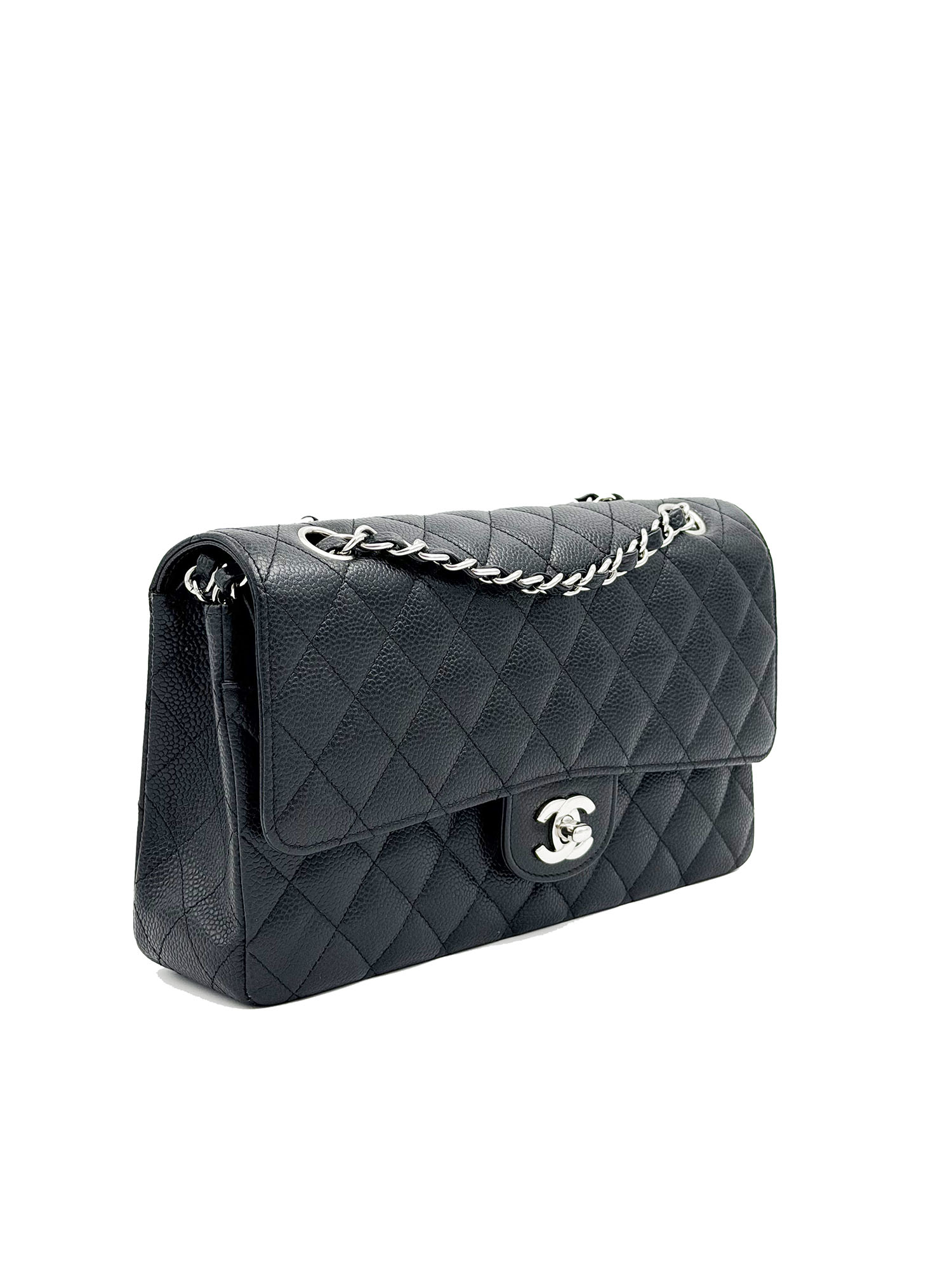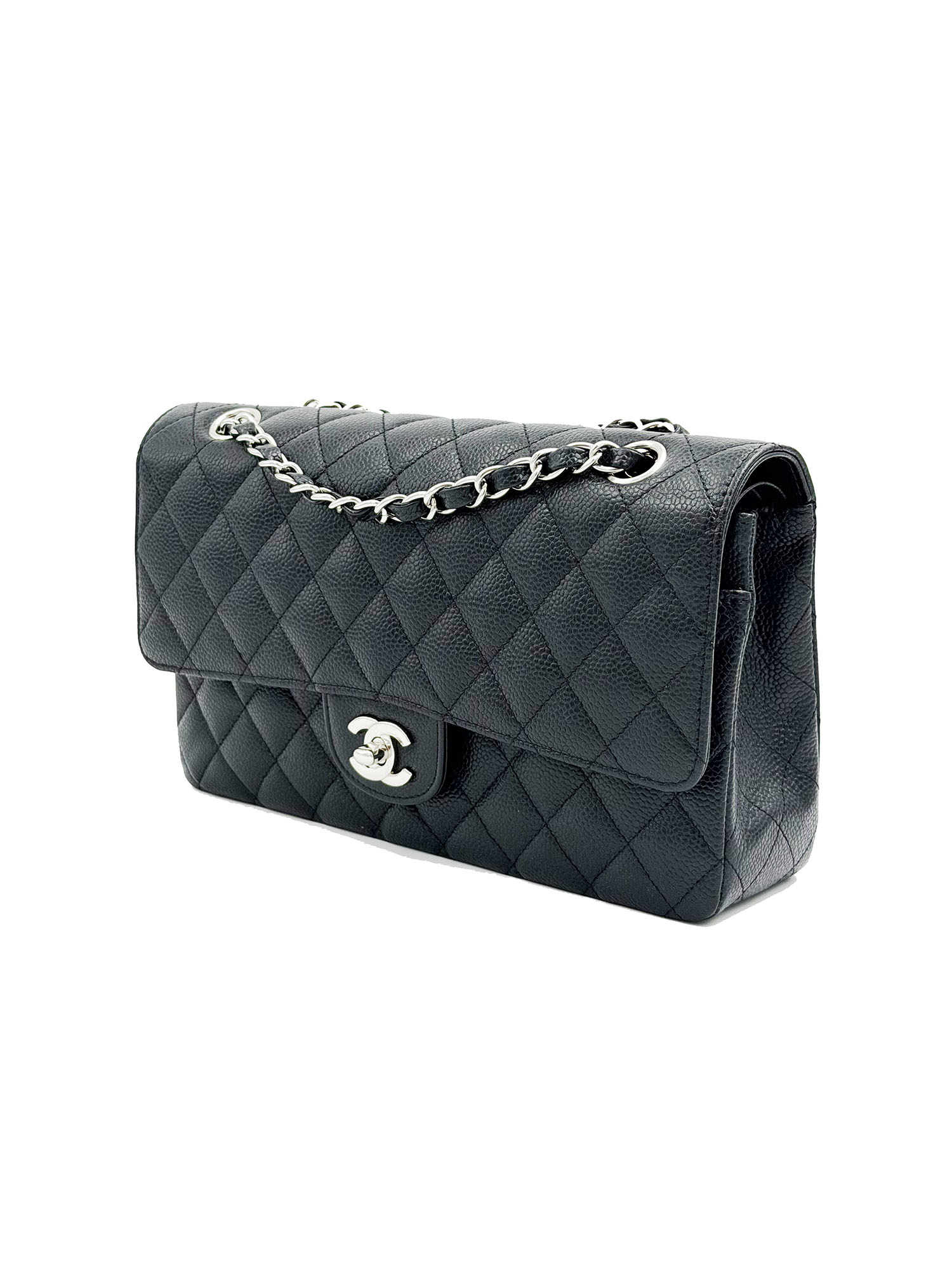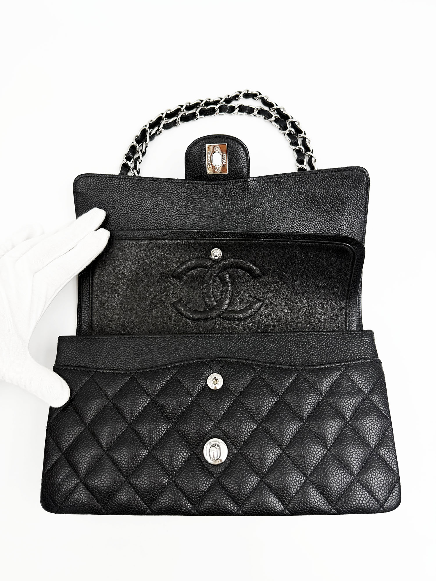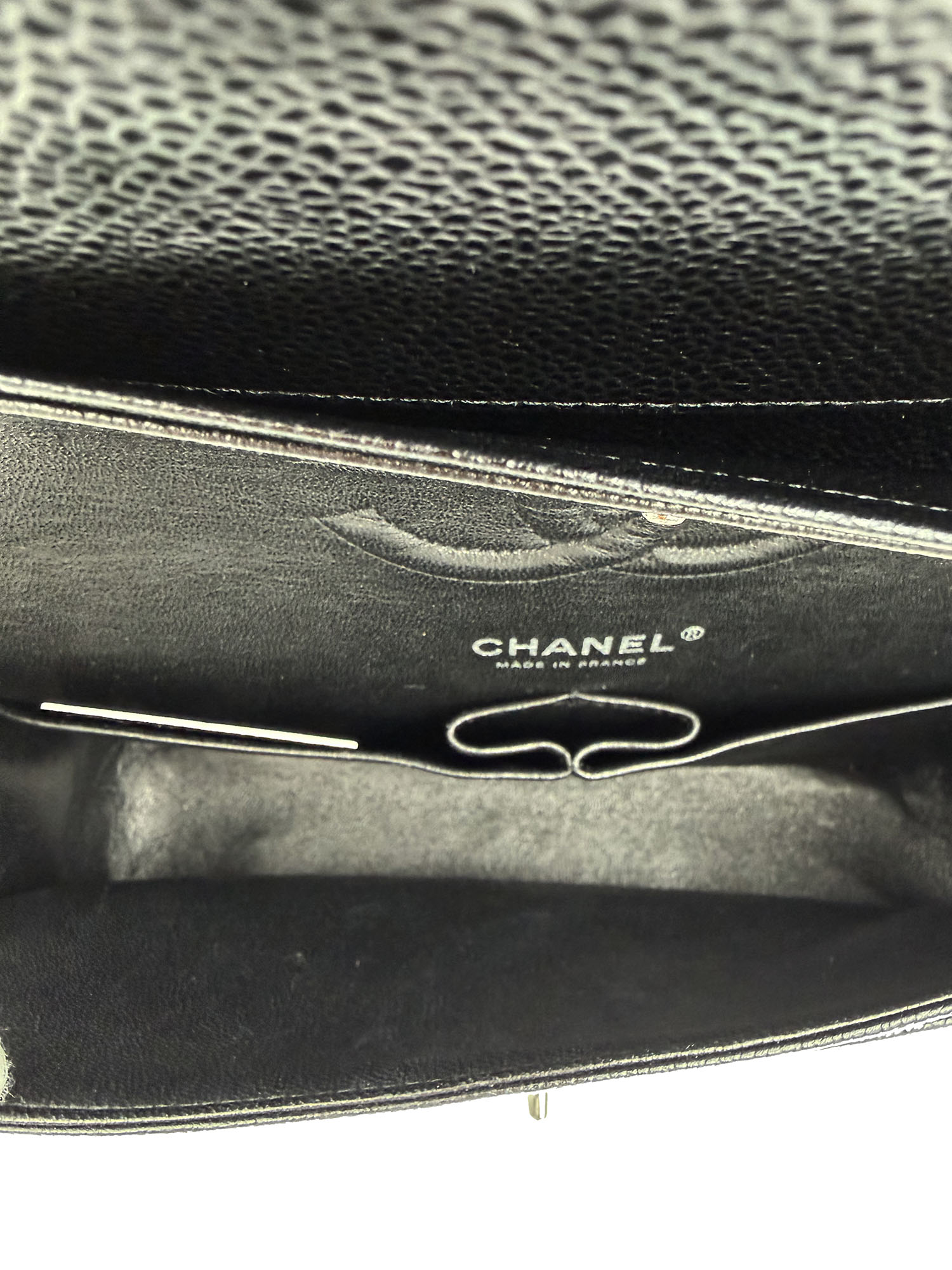 Autentica borsa Chanel classica in pelle caviar nera e metalleria argento. La borsa è degli anni 2004/2005, completa di card ed in ottime condizioni.