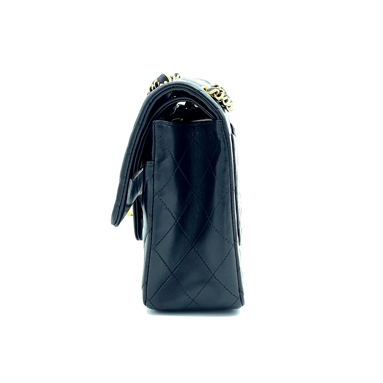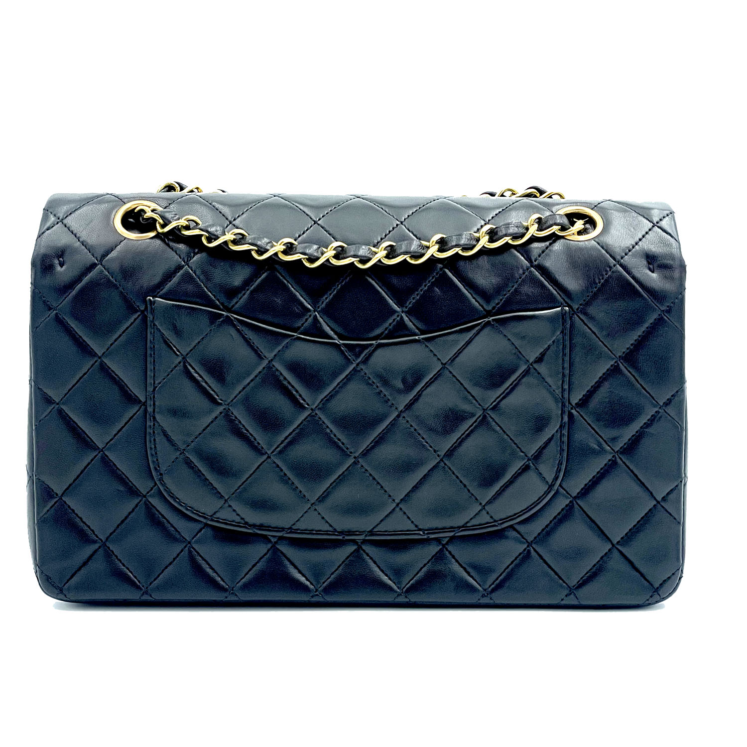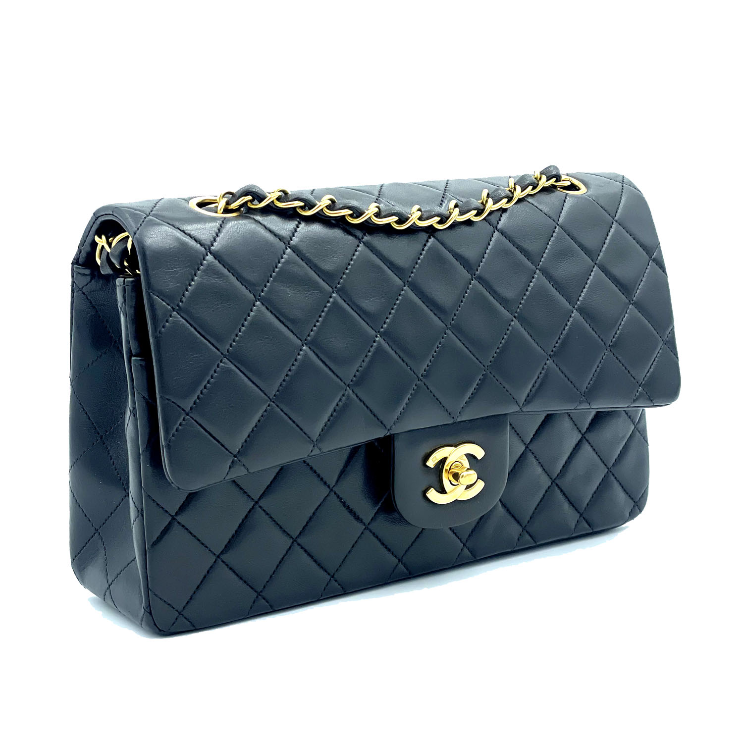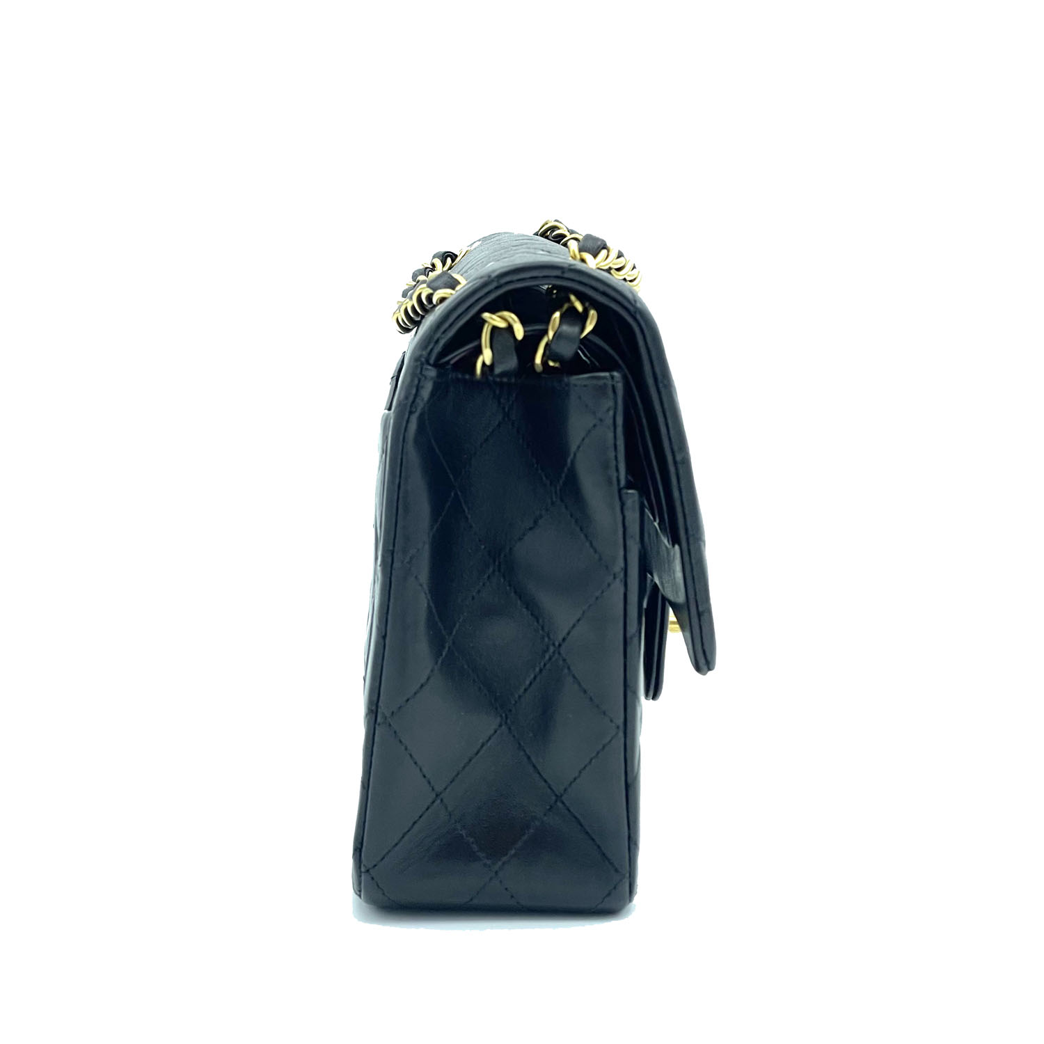 Autentica borsa Chanel classica vintage in pelle di agnello nero e metalleria placcata oro. La borsa è della metà degli anni novanta ed è in condizioni eccellenti; completa con card, libretto e scatola.