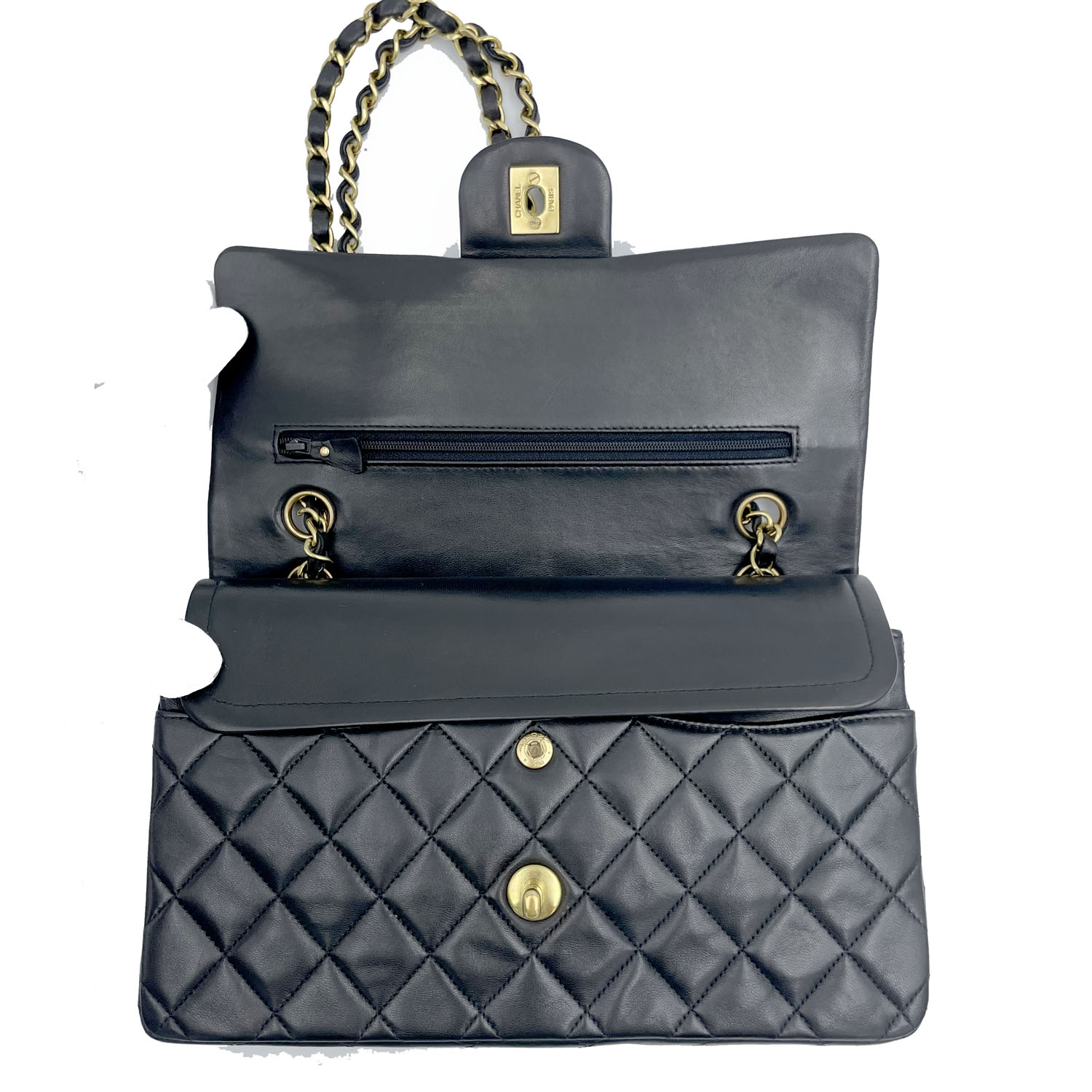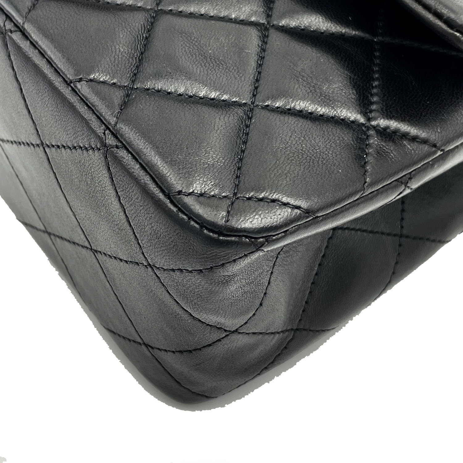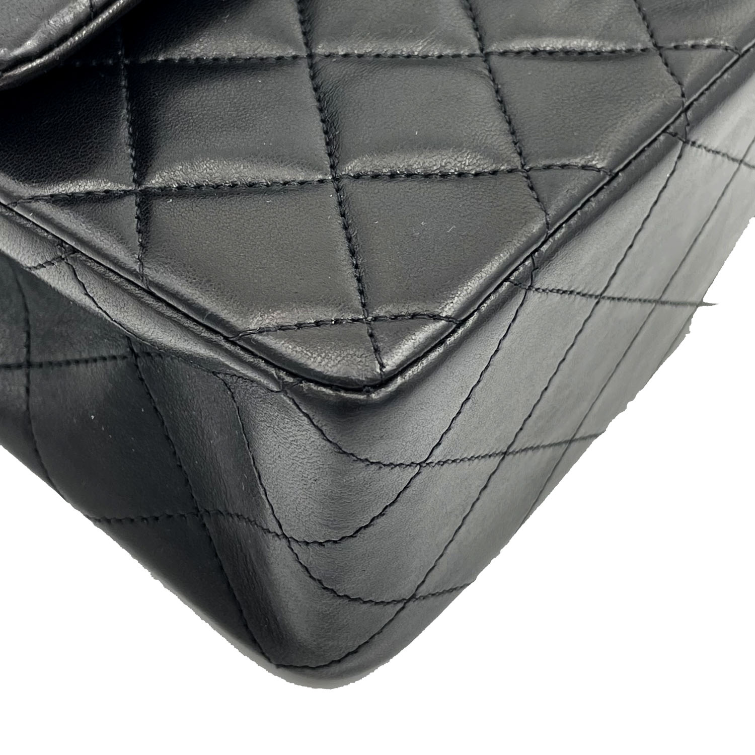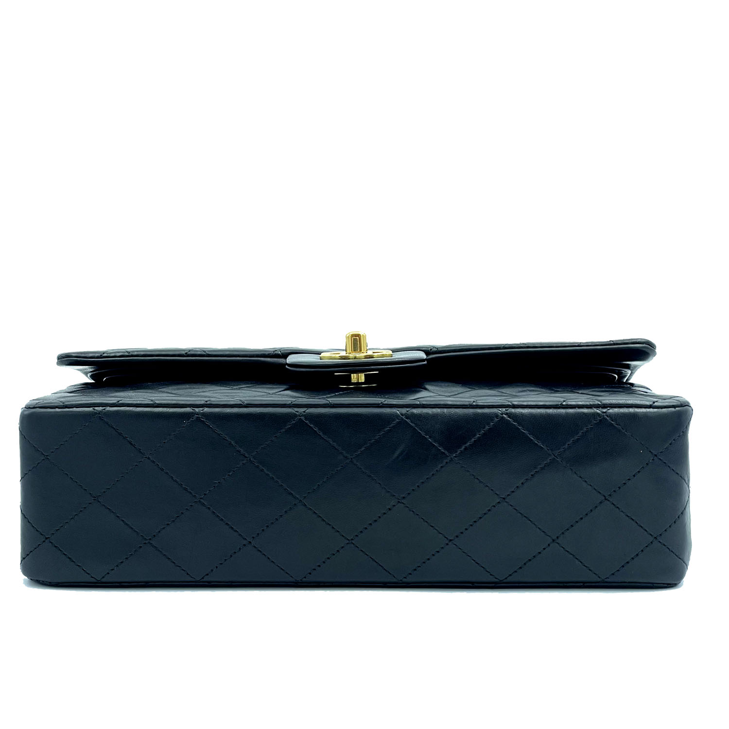 Autentica borsa Chanel classica vintage in pelle di agnello nero e metalleria placcata oro. La borsa è della metà degli anni novanta ed è in condizioni eccellenti; completa con card, libretto e scatola.