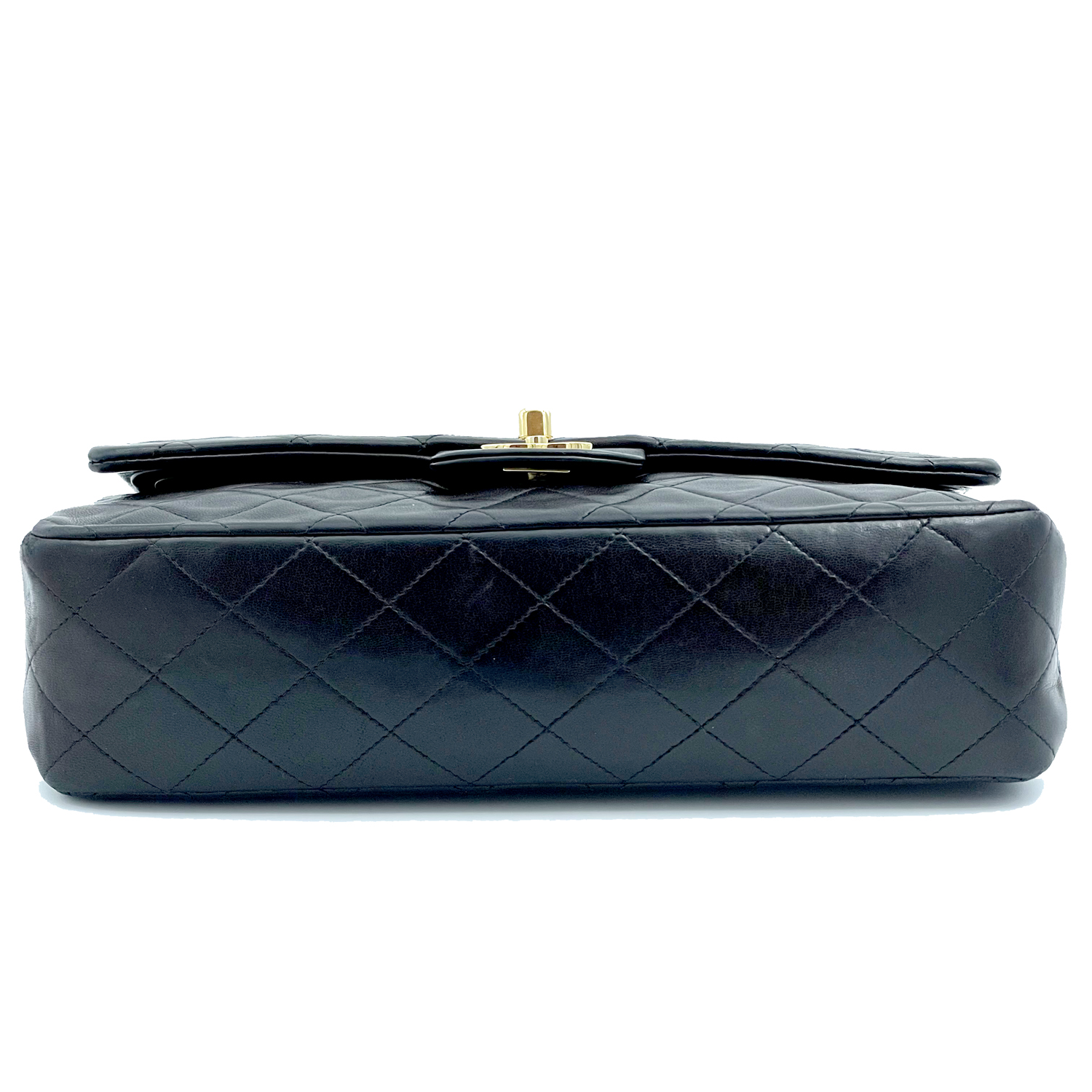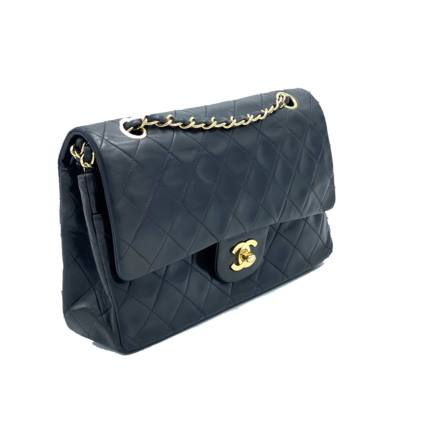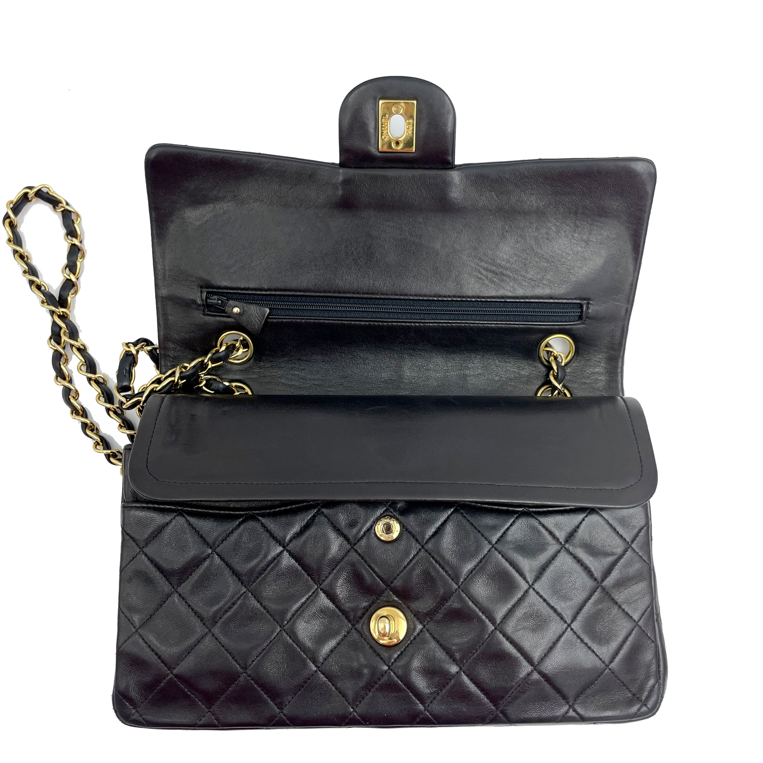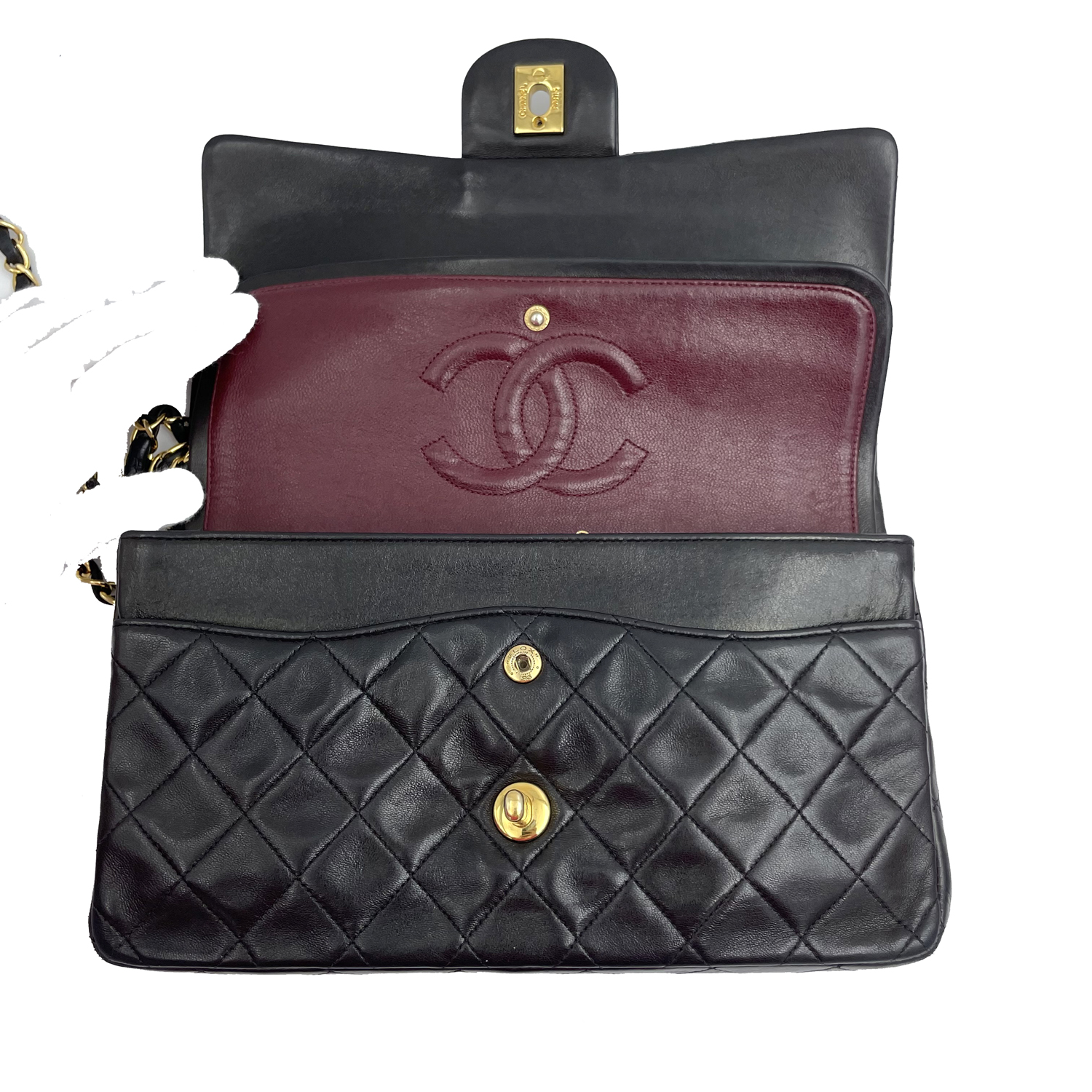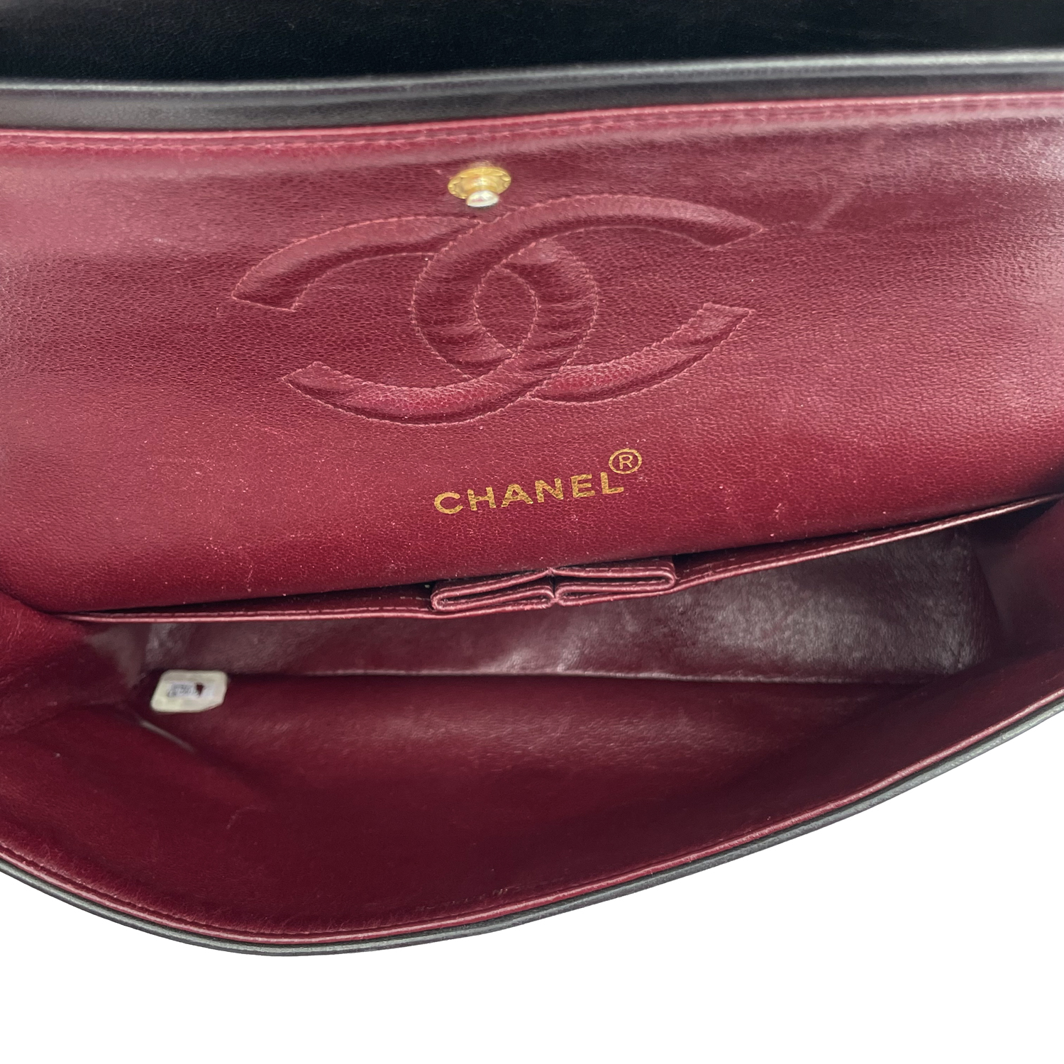 Autentica borsa Chanel misura media in pelle di agnello nera e metalleria placcata oro. La borsa è degli anni tra il 1991 e il 1994, completa di card e dust bag. Le condizioni sono molto buone con la pelle che vira gentilmente verso il marrone testa di moro come accade frequentemente alle borse di quell’epoca.