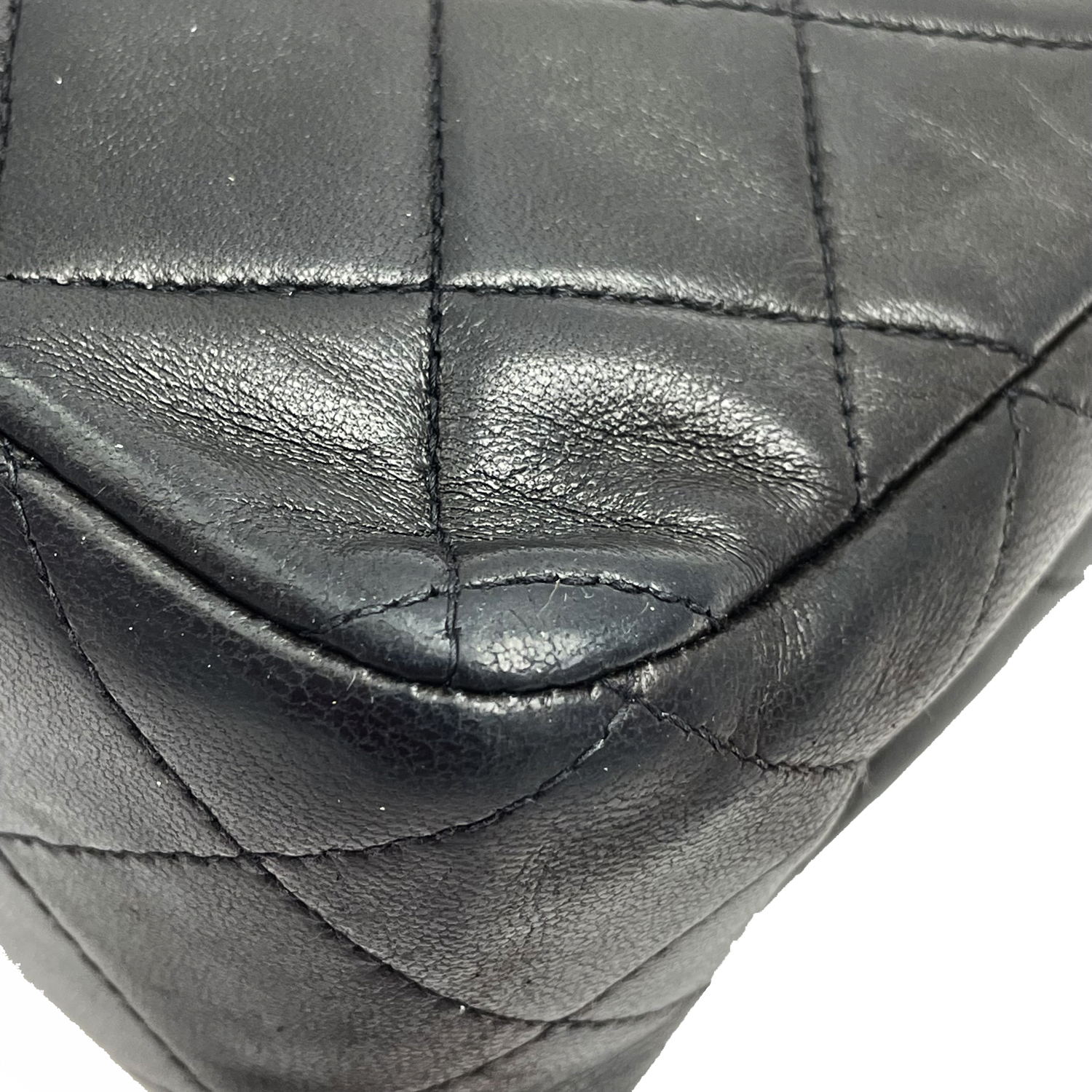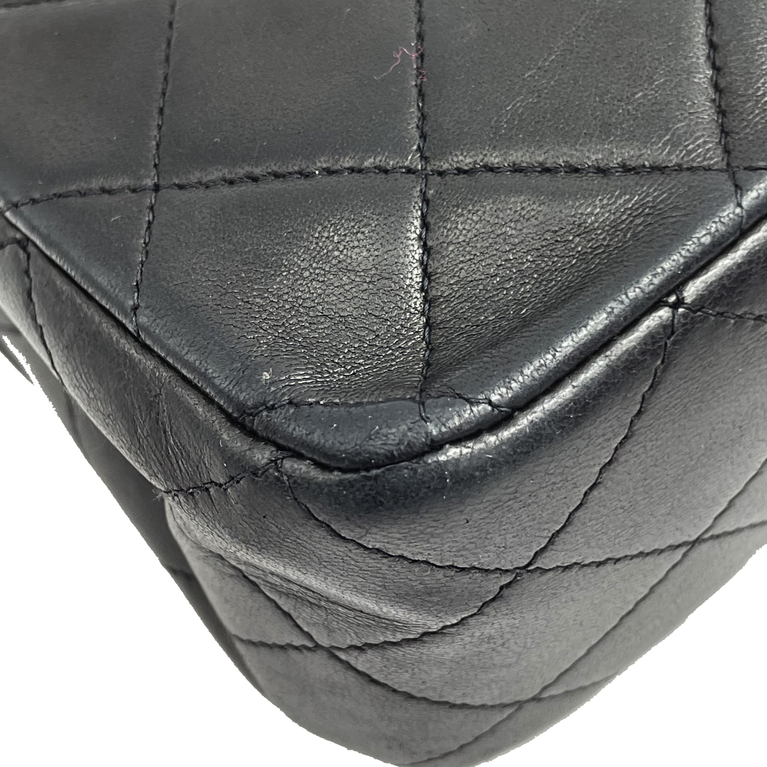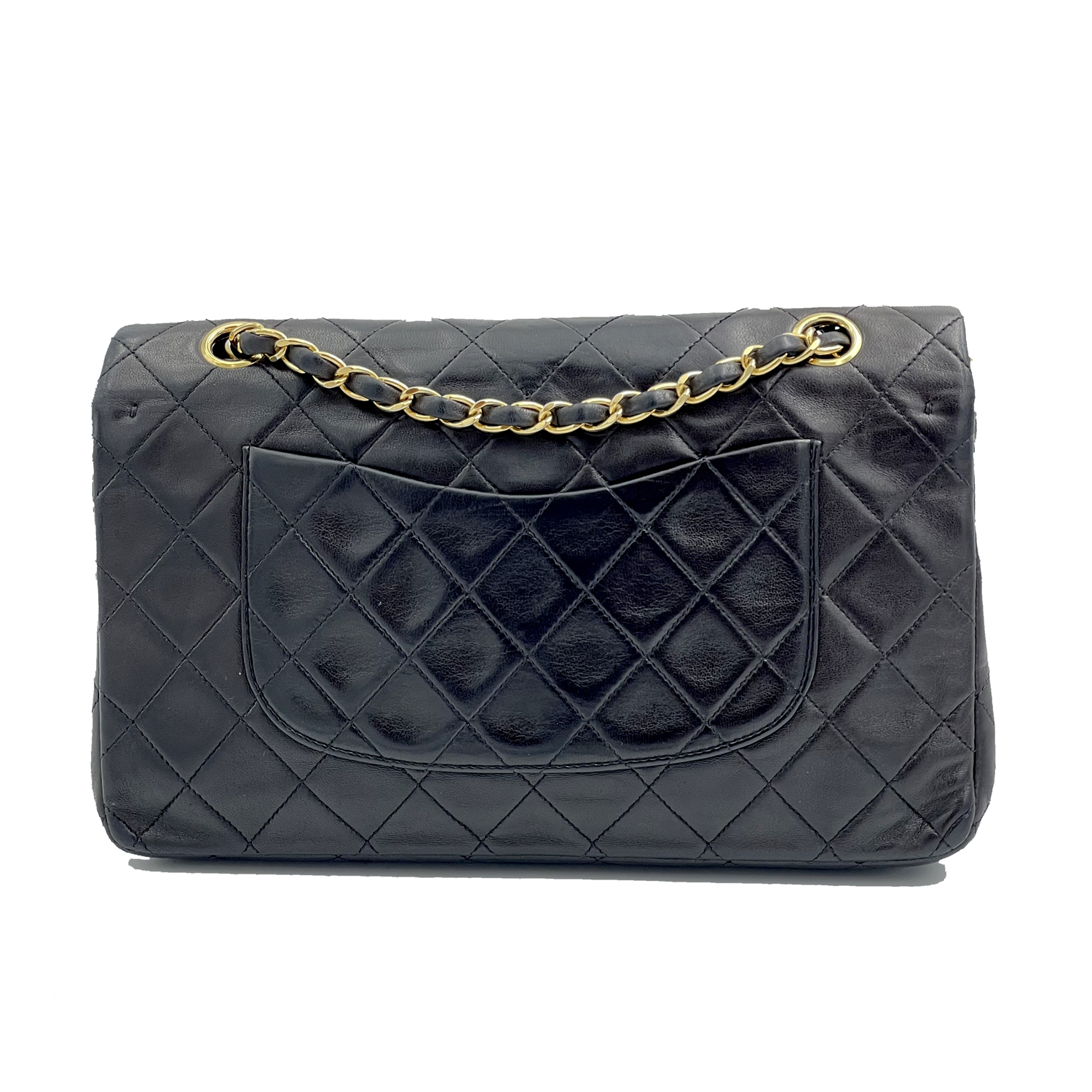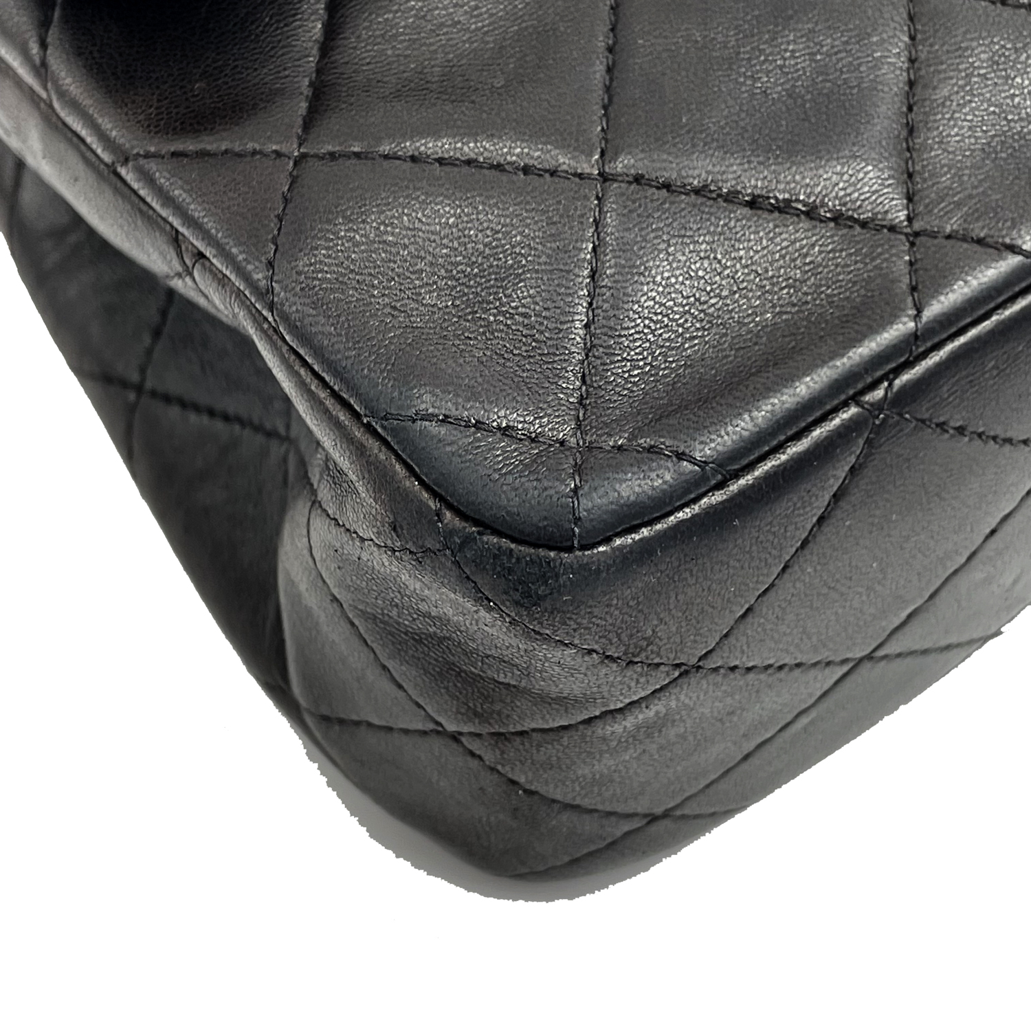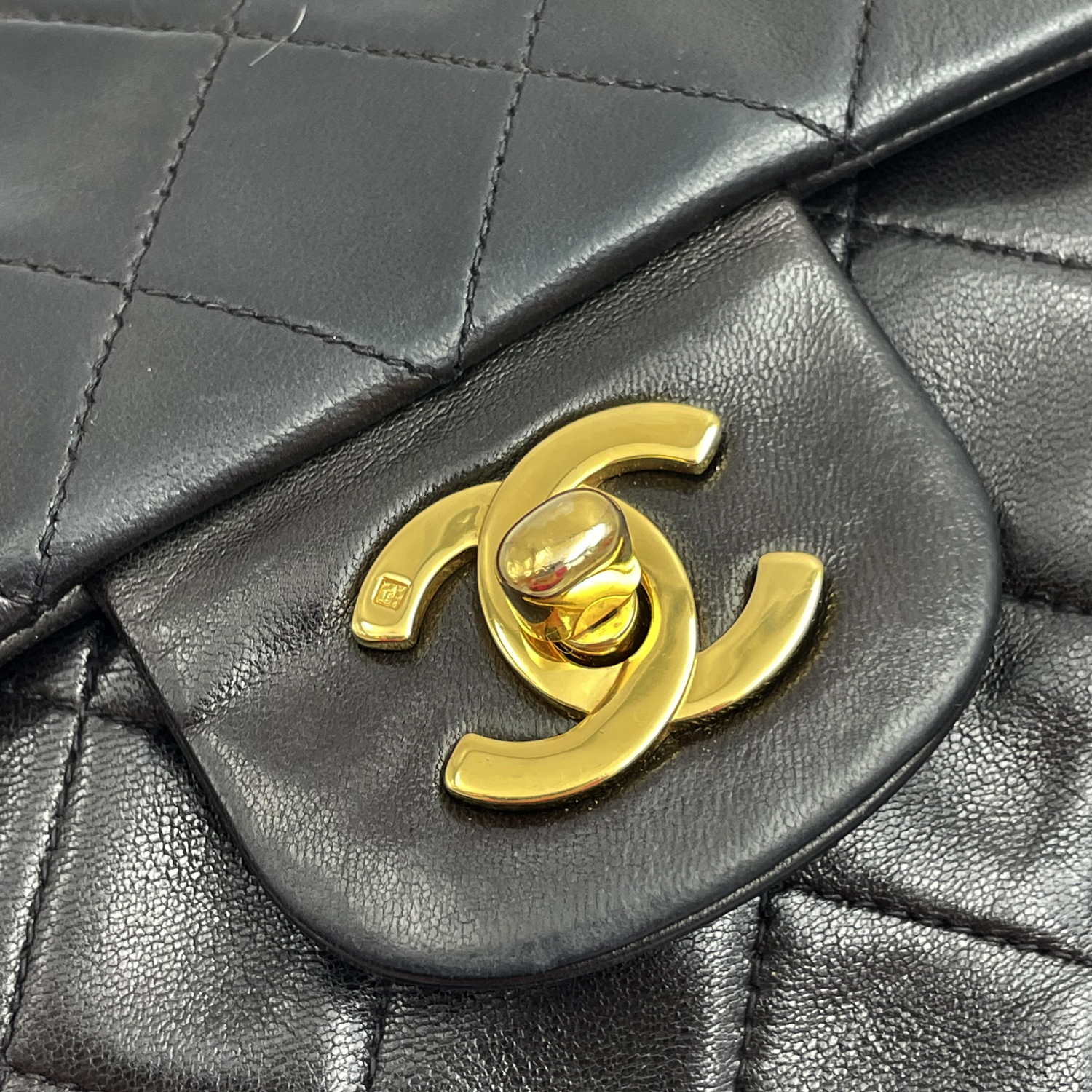 Autentica borsa Chanel misura media in pelle di agnello nera e metalleria placcata oro. La borsa è degli anni tra il 1991 e il 1994, completa di card e dust bag. Le condizioni sono molto buone con la pelle che vira gentilmente verso il marrone testa di moro come accade frequentemente alle borse di quell’epoca.