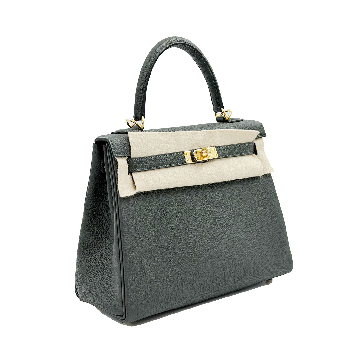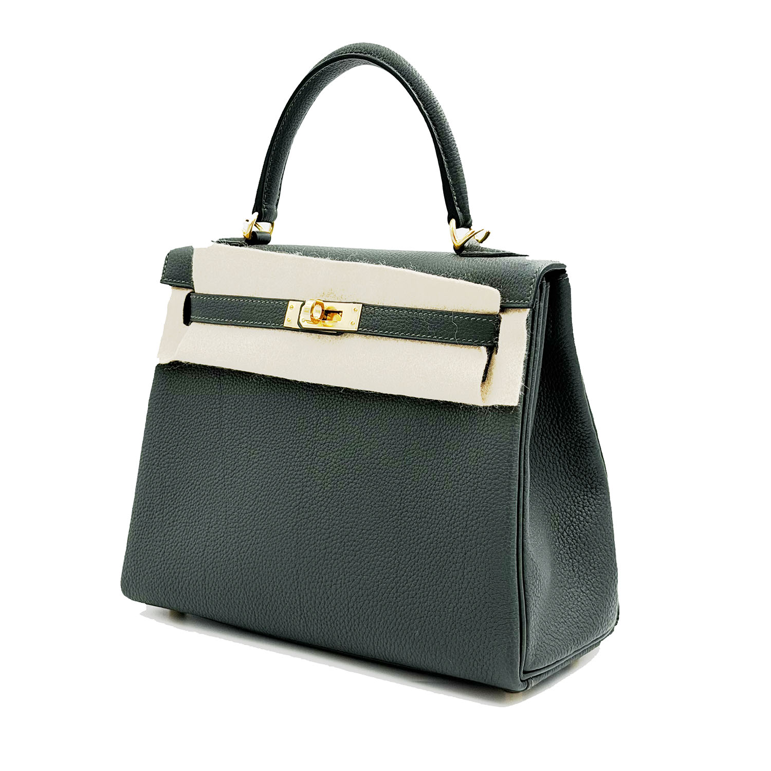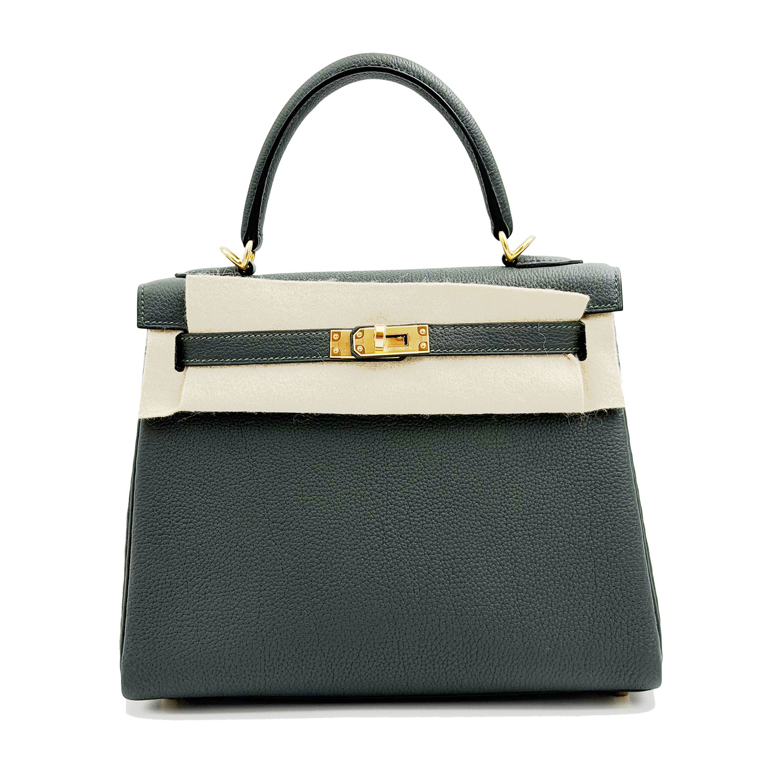 Autentica borsa Hermès Kelly 25 in pelle togo color vert mangrove e metalleria con finiture in oro. La borsa è nuova del  2025 e completa di scatola e scontrino.