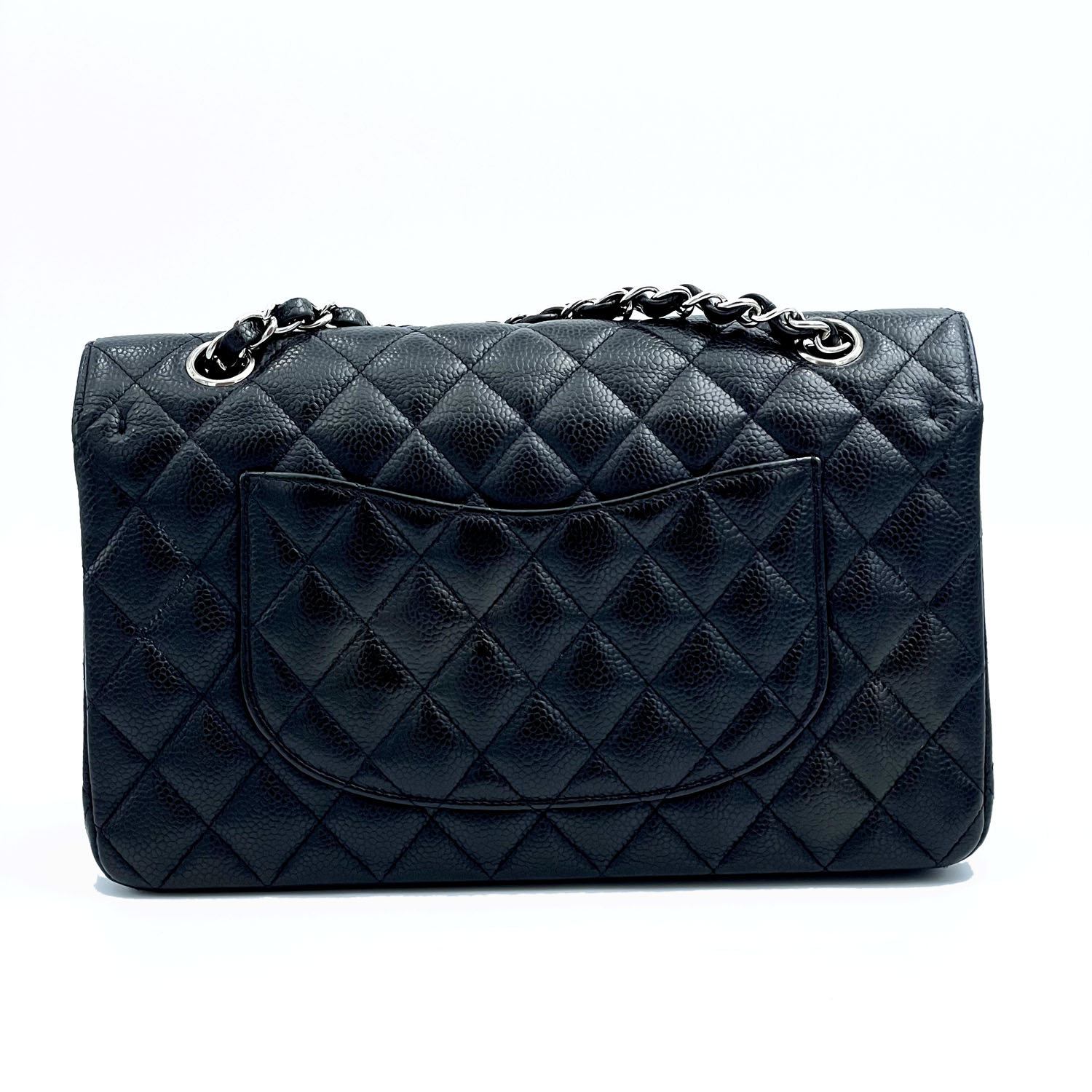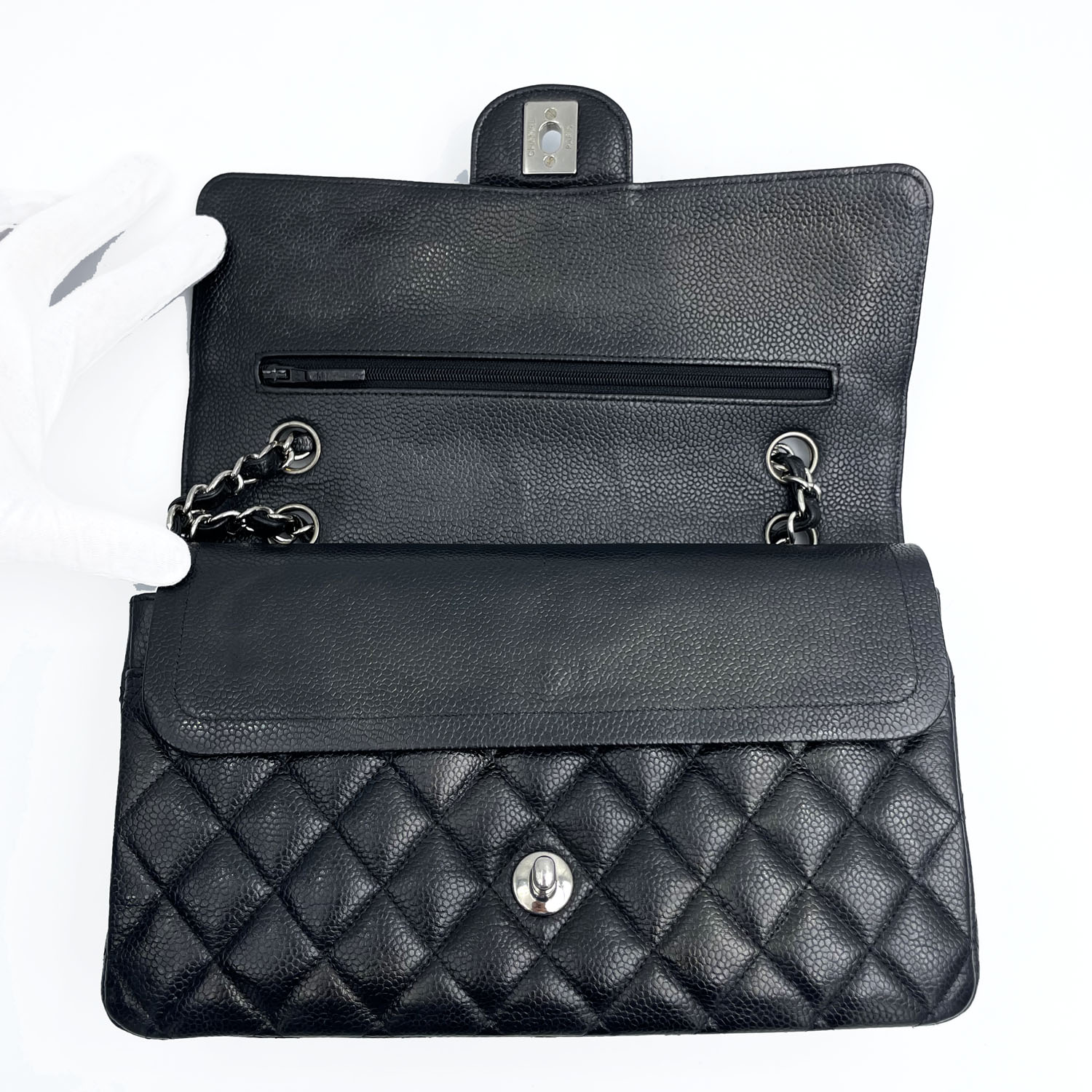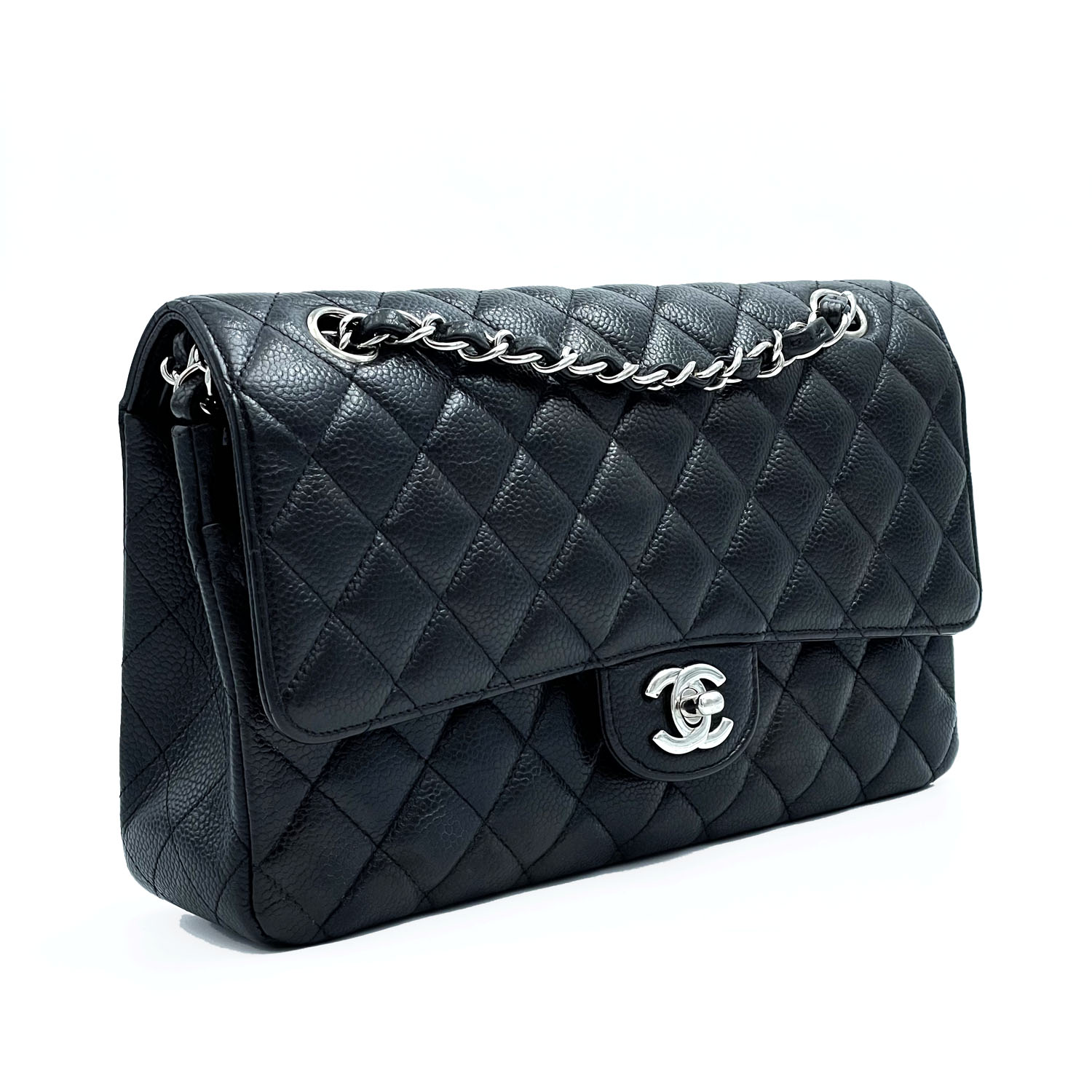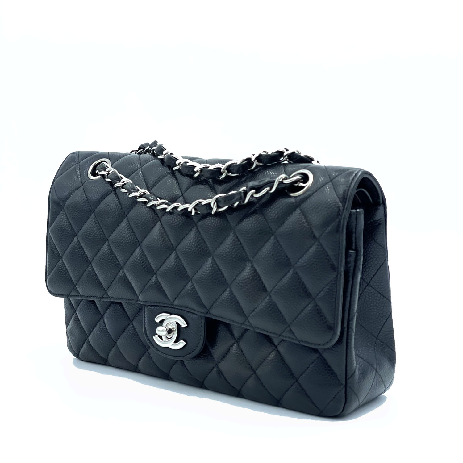 Autentica borsa Chanel modello classico in pelle caviar nera e metalleria argento. La borsa è completa di tutto il corredo: card, dust bag e scatola. Le condizioni sono ottime.